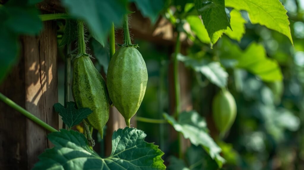 Trellising bitter melon vines improves airflow, reduces disease, and enhances fruit quality.